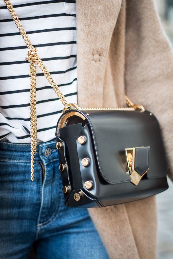 スタイリッシュなブラックxブルーのレザーにゴールドのロックスタッズやチェーンがアクセントになり、カジュアルにもシックにも馴染むのでコーデのワンポイントとして使い回しにも重宝します。
