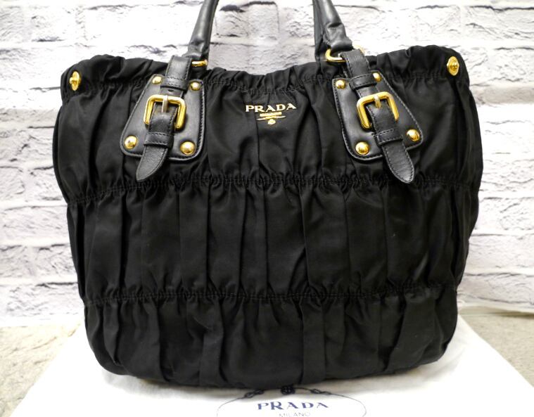 ◆PRADA プラダ ギャザーデザイン ナイロンxレザー切替 ショッパートート ハンド バッグ 黒x金◆ 使い勝手も抜群の大人気トート型モデル♪