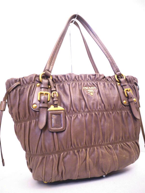 ◆PRADA プラダ A4対応 ギャザーデザイン ナッパレザー トート ハンド バッグ 茶◆ 使い勝手の良いオールレザーの可愛らしいギャザーモデル
