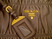 深みのあるアンニュイなグレージュのナッパレザーと優雅なギャザーはとても高級感が漂い、ゴールドの【PRADA】ロゴがさりげなく主張するシーンを選ばずに使いやすい秀逸モデルです。