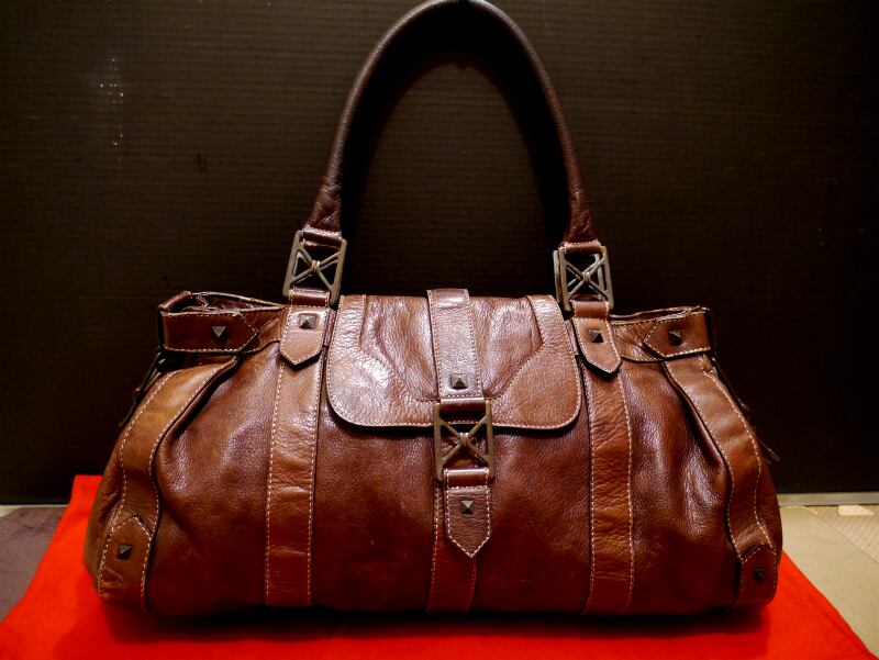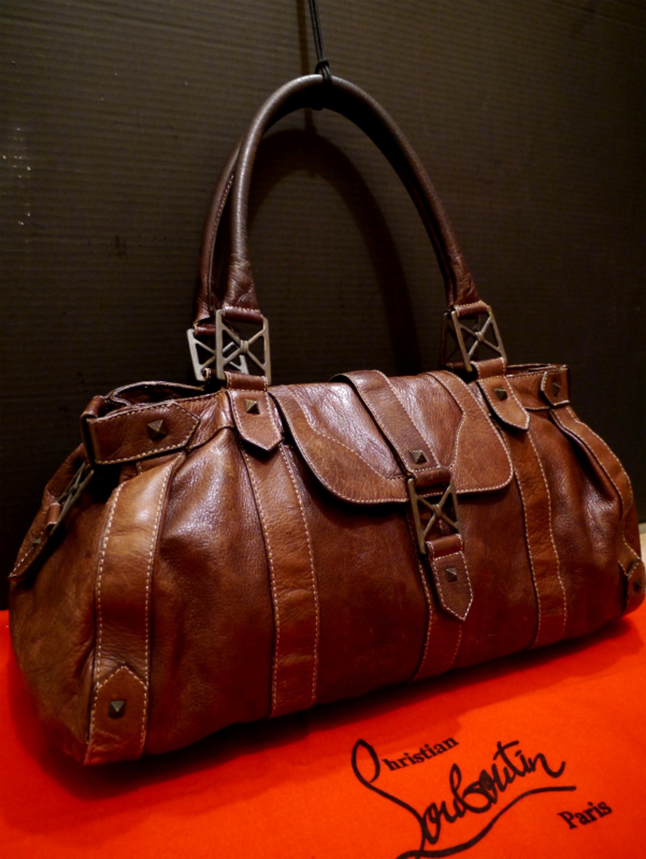 レア◆ChristianLouboutin クリスチャンルブタン スタッズデザイン ミニボストン型 レザー バッグ 茶◆ 雰囲気のあるヴィンテージレザー♪