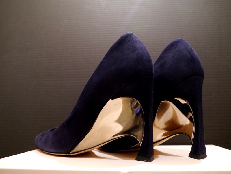 一見シンプルな印象ですが、とても上品なネイビーのスエード素材に鏡のようなミラー風の変形ヒールがさりげなく目を惹き、大人の女性も取り入れやすい大変高級感のある仕上がりです。