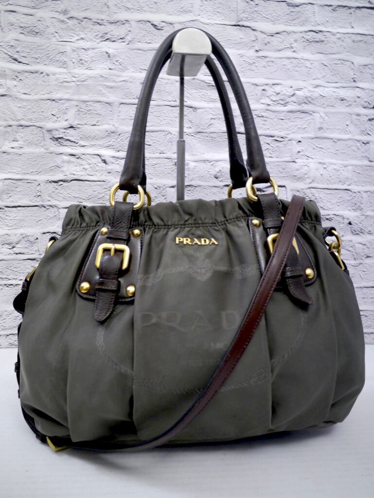 レア◆PRADA プラダ ロゴジャガードデザイン ギャザー ナイロンxレザー 2way トート ハンド バッグ 緑茶◆ デイリーで大活躍の2wayモデル♪