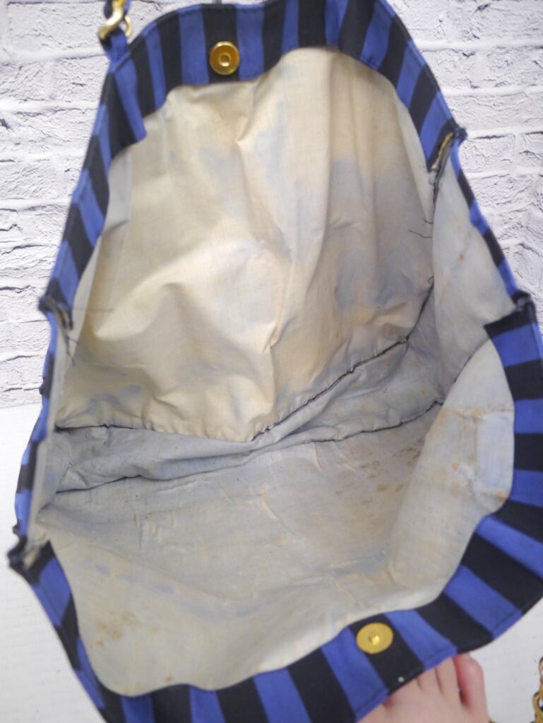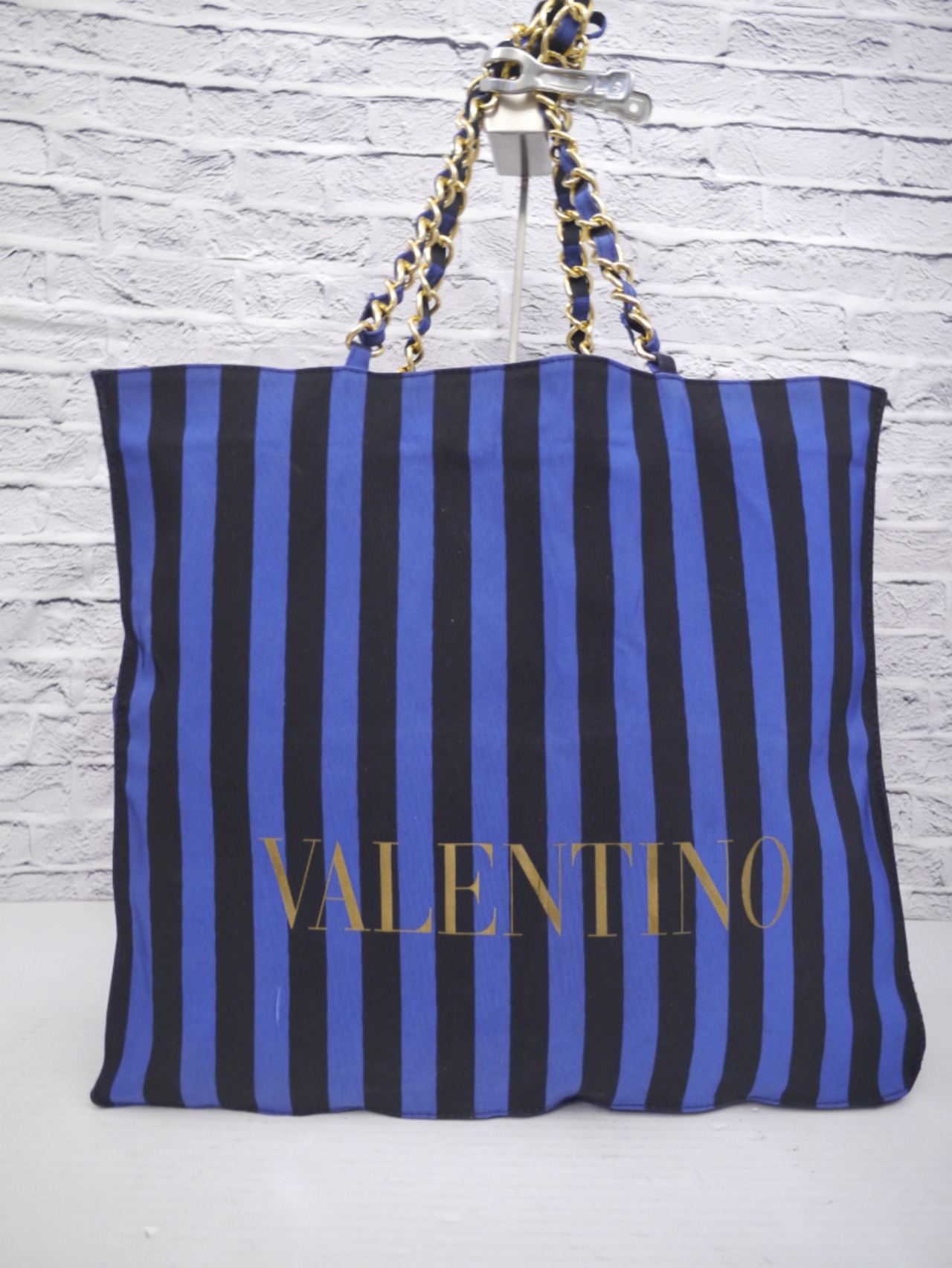 ブルーxブラックのストライプカラーに【VALENTINO】【V】の大きなロゴやゴールドのチェーンハンドルが目をひく、現在のVlogoラインの原型となったヴィンテージモデルです。