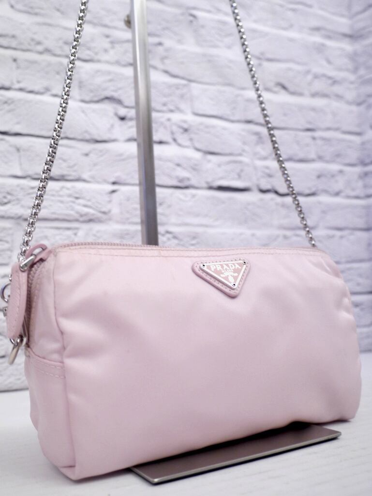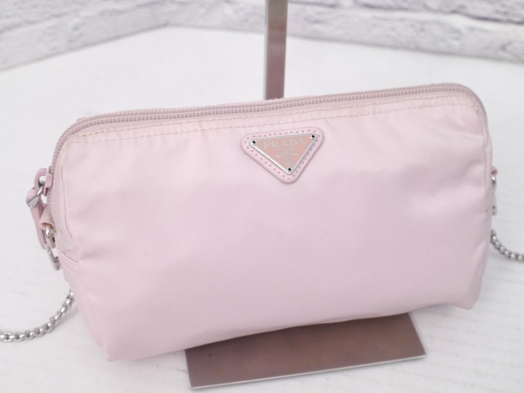 希少色◆PRADA プラダ ナイロンxサフィアーノレザー クロスボディ チェーンショルダー バッグ ポーチ ポシェット ピンク◆クロスボディ仕様