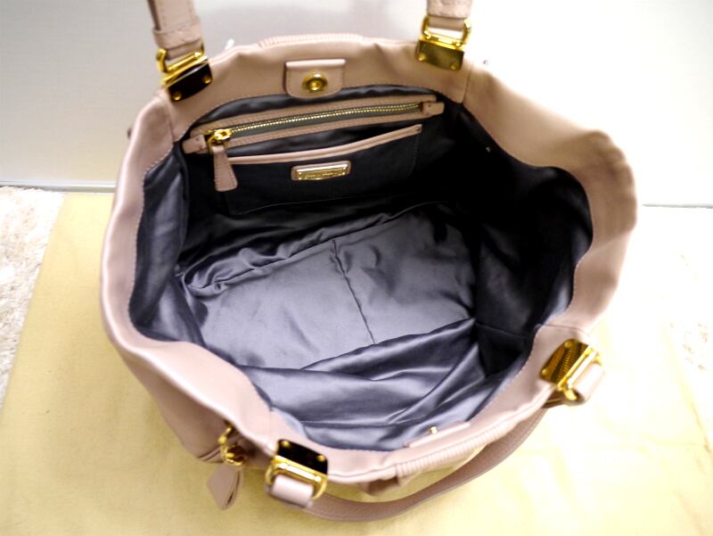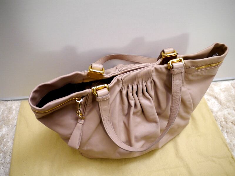 レア美品★miumiu ミュウミュウ A4対応 サイドジップ ギャザーデザインレザー トートハンド バッグ★ 希少なピンクベージュのトートタイプ
