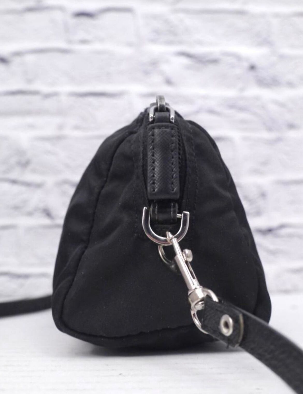 トライアングルプレートがさりげなくアクセントになったシンプルなデザインで、毎シーズンのようにリリースされるプラダの定番モデルです。