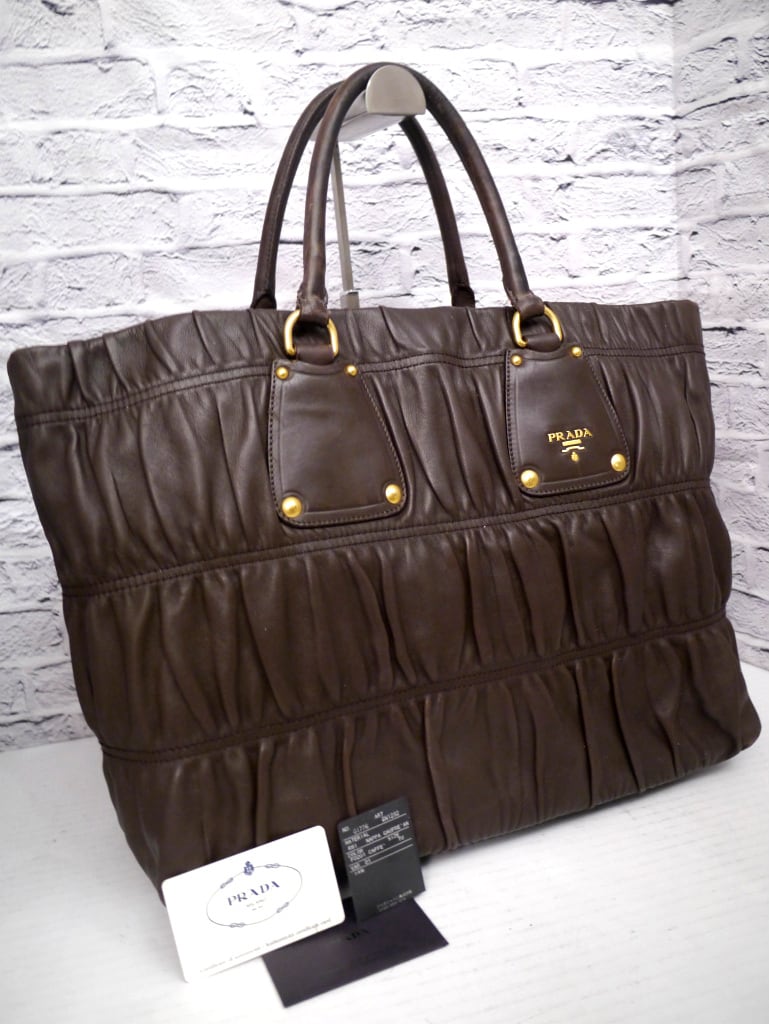◆PRADA プラダ BN1232 NAPPA GAUFRE'AN ギャザーデザイン ナッパレザー ショッピング トート バッグ 焦茶◆ 使い勝手の良い大容量モデル♪